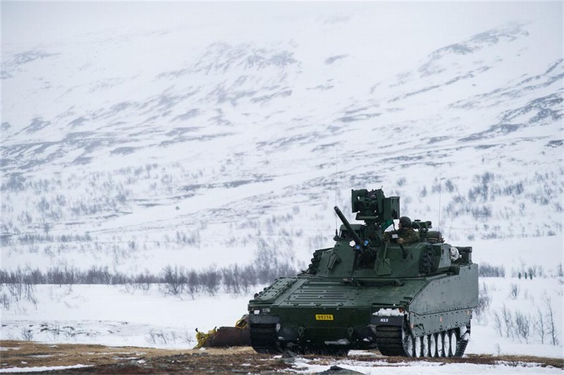 2016年4月,挪威陆军机械化营士兵的战术演习,该部队装备BMP CV-90战车。