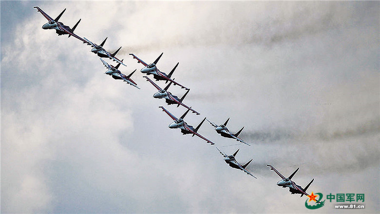 受阅战机升空进行彩排,五架“俄罗斯勇士”苏-27和四架“雨燕”米格-29组成著名的“古巴钻石”编队。