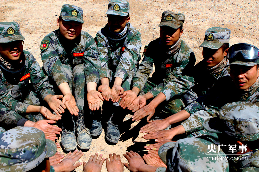 训练间隙,官兵们对着镜头秀出双手。黄腾飞 摄