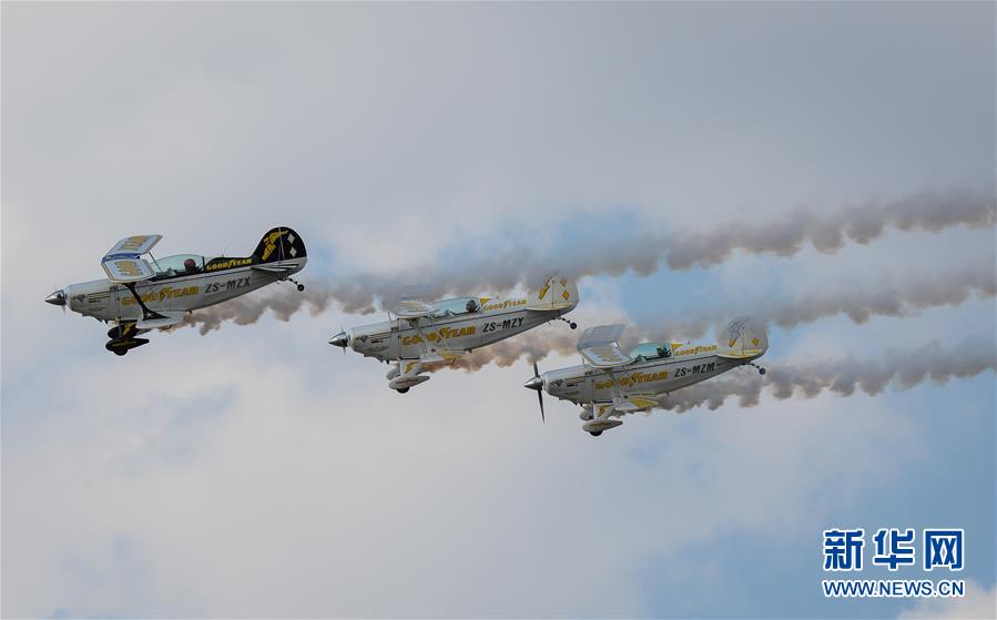 5月7日,三架固特异雄鹰飞行表演队的飞机在南非比勒陀利亚附近的空军基地进行特技表演。当日,南非空军博物馆一年一度的飞行表演秀在该国行政首都比勒陀利亚附近的空军基地上演。来自南非空军、航空公司和飞行表演队的近120架飞机共呈献了超过30个飞行表演节目,吸引了数万名观众到场观看。记者翟健岚摄