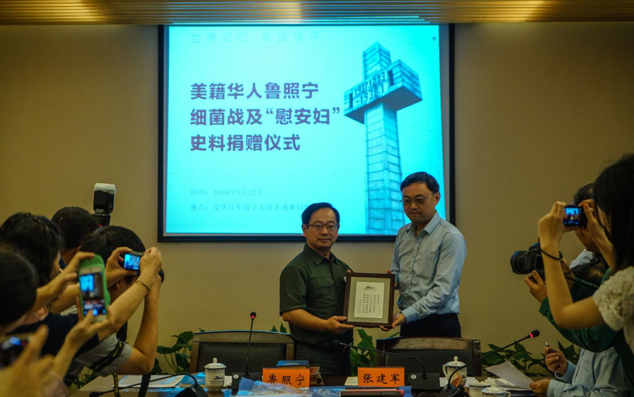 5月12日,在侵华日军南京大屠杀遇难同胞纪念馆,馆长张建军向鲁照宁(左)颁发捐赠证书。新华社记者李响摄