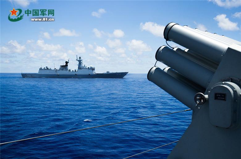 09:00—10:00,第一个训练科目:编队队形变换。刚出军港,编队一边航渡前进,一边进行队形机动。