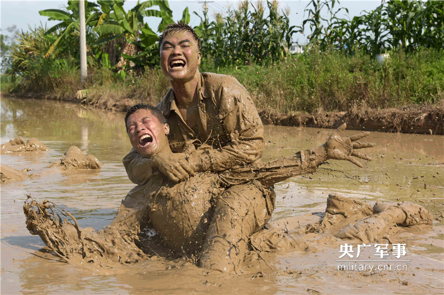 6月12日,武警战士在泥潭中进行擒敌搏击训练。王俞 摄