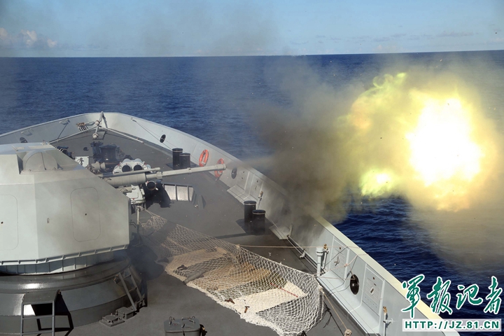 “目标跟踪好!”“射击!”舰炮指挥员、衡水舰舰长张小生一声令下,舰艏主炮立即开火,在目标海面激起道道冲天水柱。
