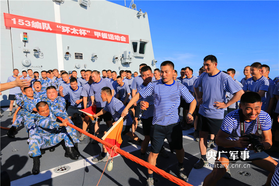 16时30分,一阵阵嘹亮的口号声响起,一排排身着海魂衫的水兵在西安舰飞行甲板上整齐列队。随着编队指挥员王社强宣布:“环太杯”甲板运动会开幕。寂静的太平洋某海域瞬间被一阵阵激情点燃。