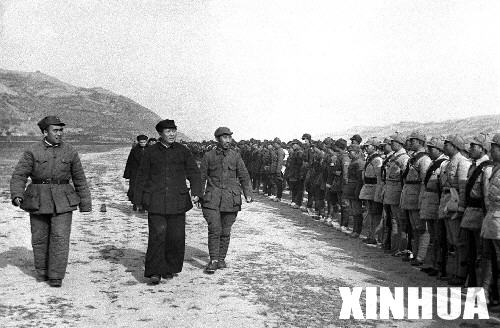 1944年11月9日,八路军第120师359旅4000余人,奉命组成南下支队,挺进豫、鄂、粤敌后,开辟新的抗日根据地。图为毛泽东和朱德由王震陪同,在延安机场检阅即将南下的部队。 新华社发