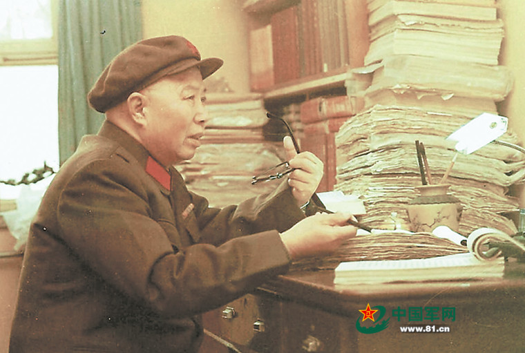 萧锋在堆满书稿的办公室里沉思。资料图片