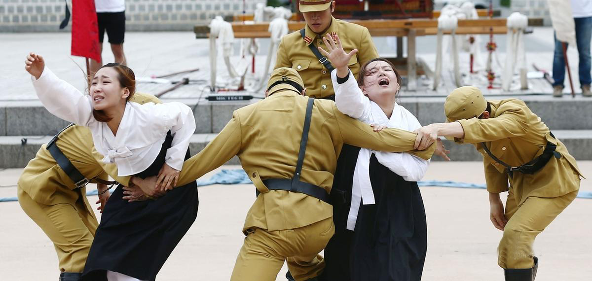 当地时间2014年8月10日,韩国首尔,文化机构在光化门广场演出“慰安妇”题材戏剧,督促保障日军“慰安妇”受害者的权益。