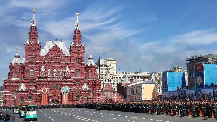 在红场阅兵一开始,来自俄罗斯第154独立警卫团仪仗营的一队士兵高举着两面象征俄罗斯的旗帜——胜利旗和俄罗斯国旗,列队通过受阅部队方阵和坐满老兵及贵宾的观礼台前通过红场。这个时候,俄罗斯军乐团演奏的《神圣的战争》再一次响彻红场上空。