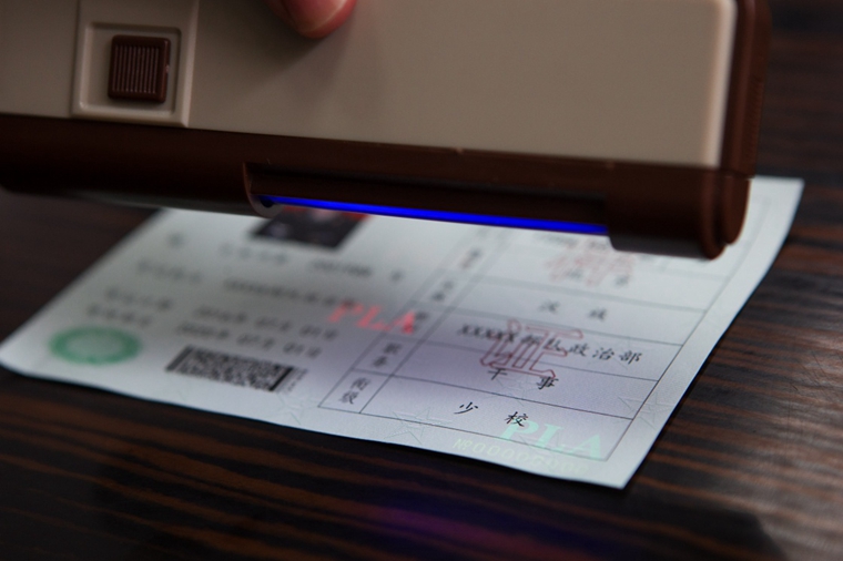 在荧光照射下,2016式军官证内页上出现“PLA”字样防伪标识(6月29日摄)。新华社记者 琚振华 摄