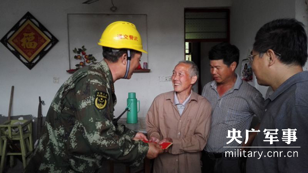 央广网泰宁5月14日消息(龚小江)5月13日下午5点钟,对于福建省泰宁县大龙乡官江村70岁的杨六斤老人来说,是一个让他感动的时刻。因为在这个时刻,武警交通部队把2000元慰问金和米面油等生活用品送到他的手中,为他解了燃眉之急。