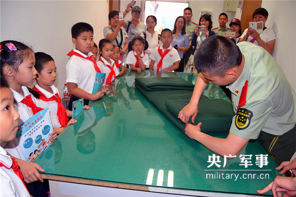 武警战士为小朋友演示叠被子。姜润邈摄