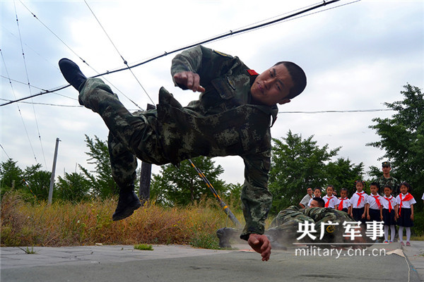 官兵为小朋友表演军事动作。姜润邈摄