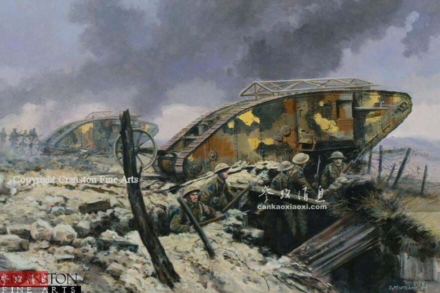 一战期间,英军Mark I(雄性)坦克准备向德军防线发起突击。