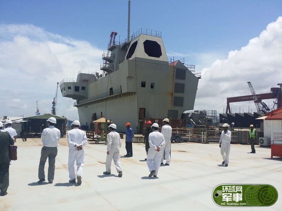 印度国产“维克兰特号”航母自2015年6月初第三次下水后,时间已经过去一年多了。最近,又有新的工程进度图出现在互联网上。光从图片上来看,好像进展不大,安装舰体右侧的舰岛仍然是一个空壳子,基本上没装任何设备。