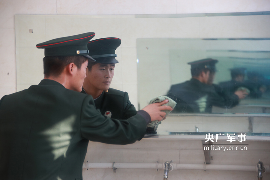 因任务冲突推迟退伍的老兵任沛阳在擦拭洗手间镜子,临走前为连队再做贡献。袁凯 摄