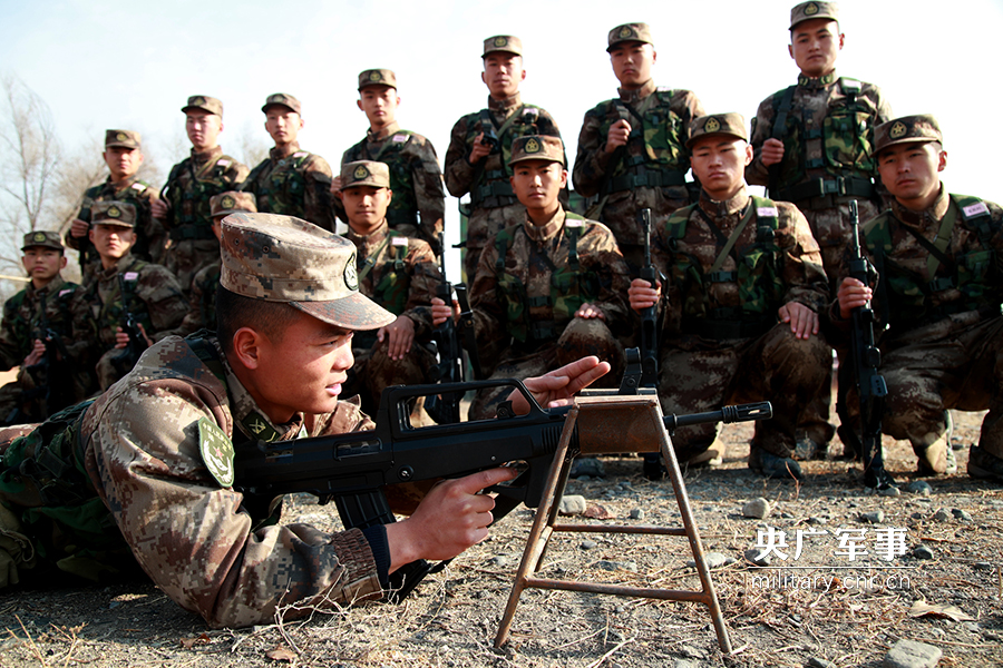新兵班长钟旺给新战士们讲解自动步枪射击要领。袁凯 摄