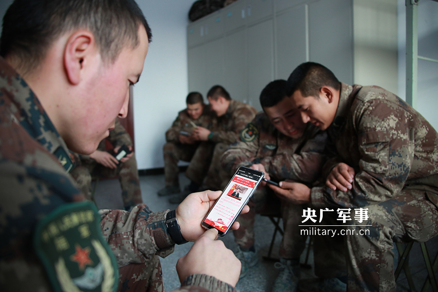 少数民族官兵利用休息时间通过手机微信公众号学习十九大精神。袁凯 摄