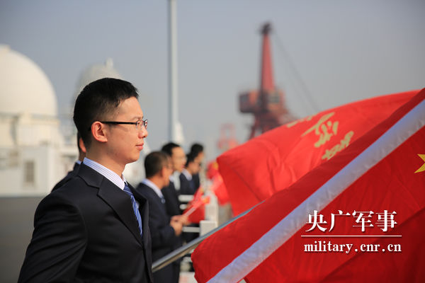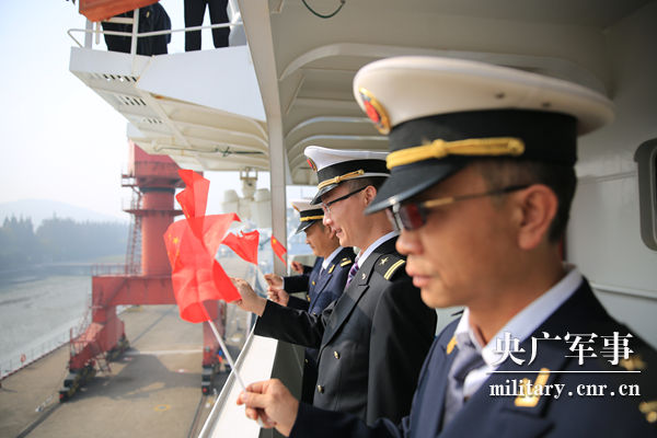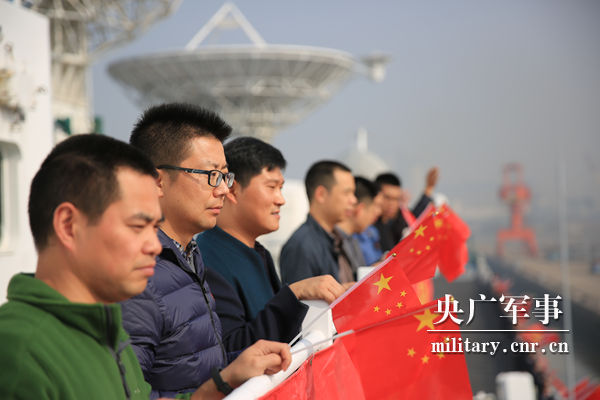远望7号船缓缓驶离码头,红旗迎风飘扬。王哲摄