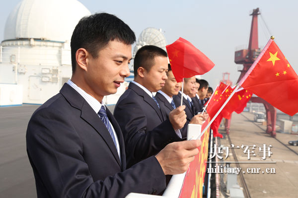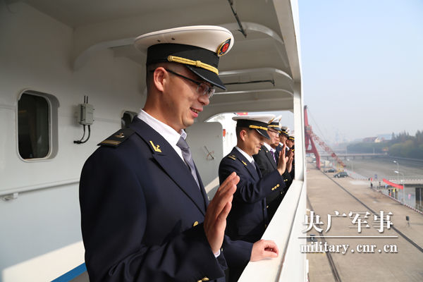 船员们与送行人员挥手告别。王哲摄