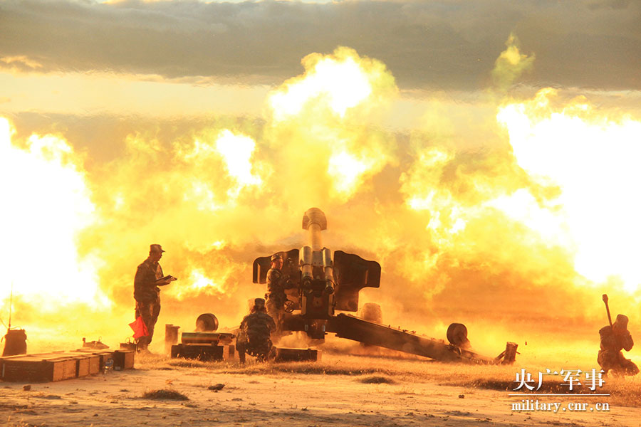 炮兵群夜间实弹射击火光冲天