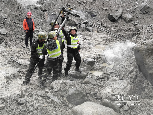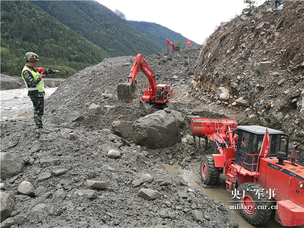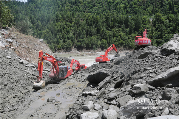 一侧是怒吼滚滚的帕隆藏布江,一侧是高如山丘的泥石流堆积物,8名先遣队员,徒步穿越在淤泥遍地、凶险万分的灾害现场勘察灾情。抢通中,养护十三中队操作手丰大富,连续工作16小时,无论暴雨或日晒,始终忍受生理极限不下火线,打破了中队操作手连续抢险作业时间的最高纪录。13日15时43分,经过参战官兵50多个小时连续奋战,索通村路段成功抢通。