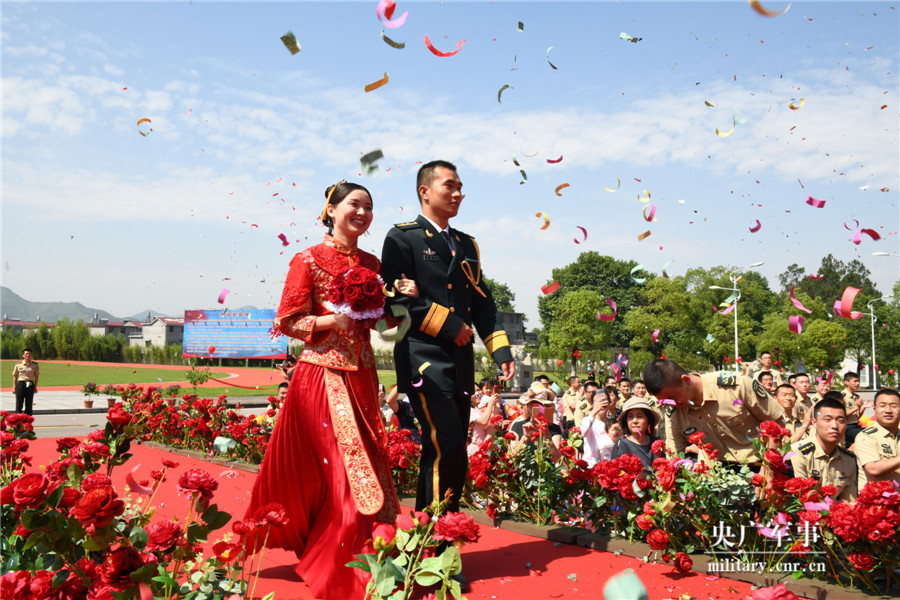 央广网景德镇5月23日消息(记者李攀奇 郝铮 李明)5月22日,火箭军某部首届“爱在瓷都·情定军营”集体婚礼活动在景德镇举行。21对新人在全体官兵和亲人家属的见证下步入婚姻殿堂。该部党委常委、驻地领导、全体官兵及新人亲属出席婚礼仪式。