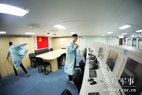 出海需要勇气,因为风浪不时侵袭,任务前设备检修更需要勇气,茫茫大海之上远望号船就像一叶浮萍,而远望人要做的就是稳中求胜。图为:某任务前科技人员对所有设备进行安全故障排查。