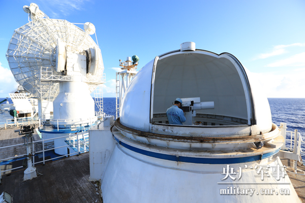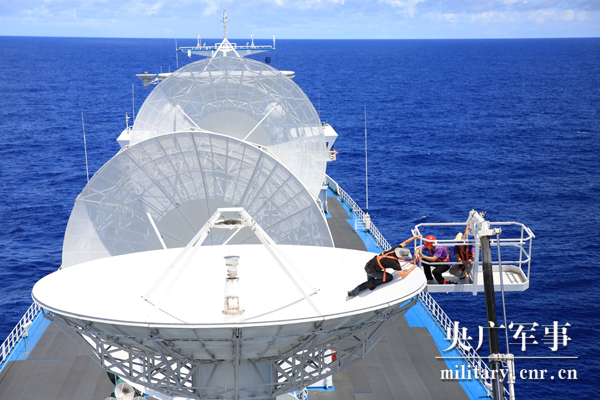 任务前设备维护,枯燥繁琐。但枯燥繁琐正是远望人需要坚守的本心,失之毫厘差之千里,远望人意思都不敢马虎。图为:远望5号船在任务前检修设备。