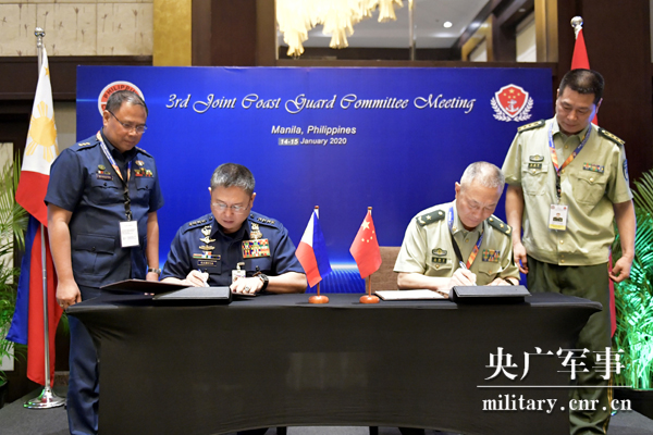 1月16日,中国海警局局长王仲才(右二)和菲律宾海岸警卫队司令加西亚(左二)共同签署了中菲海警海上合作联合委员会第3次会议纪要。郑国彬 摄