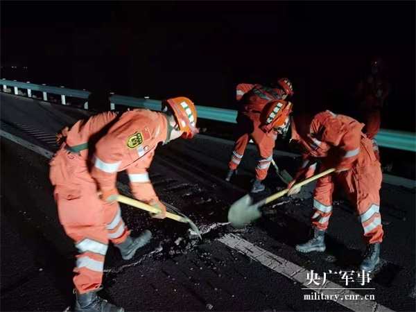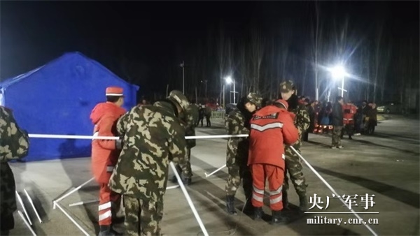 23时许,救援官兵长驱68公里抵达震中地区,而后立即展开现场勘查、生命搜索、破墙救援等工作。救援中,现场余震不断,部分房屋出现明显裂缝。官兵们冒着危险逐个房屋进行搜索,对现场受灾群众进行疏散和转移。