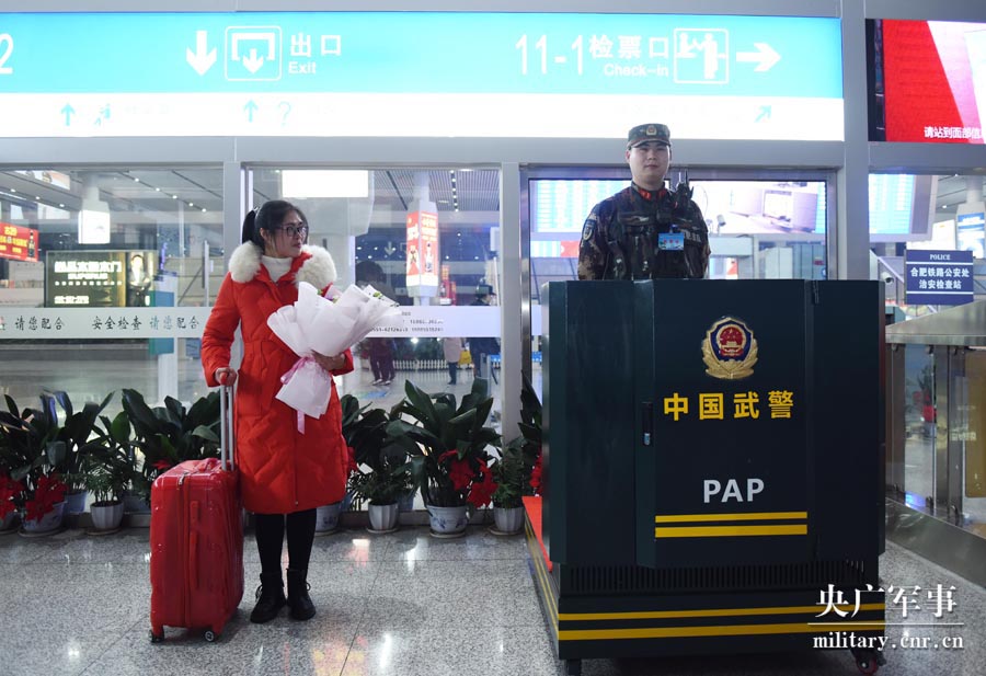 “老公,你辛苦了!”下车、出站再到达合肥南站东进站口,这是军嫂徐勤芳一路辗转见到,正在担负春运执勤的爱人孙浩说的第一句话,孙浩行军礼回应妻子,徐勤芳顿时热泪盈眶。由于孙浩还在执勤中,军嫂徐勤芳就静静地守在哨位旁,陪爱人一起执勤。