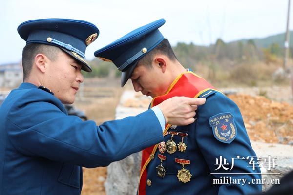 部队领导为黄飞虎挂绶带