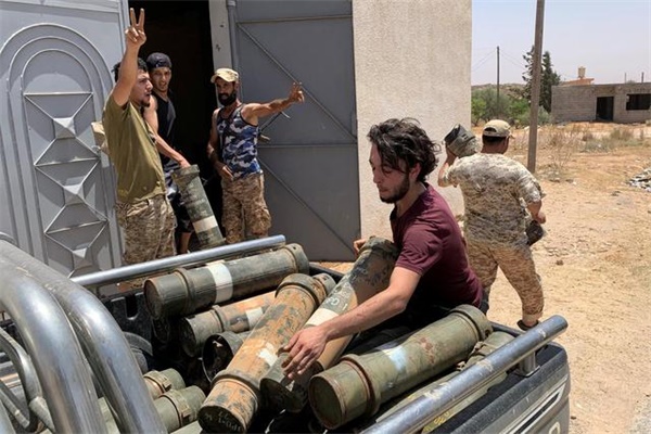 6月5日,利比亚民族团结政府武装人员在夺回泰尔胡奈市后搬运没收的武器(新华社/路透)