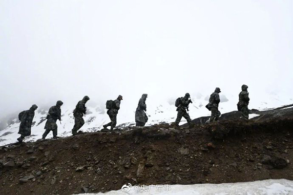 西藏军区某边防团官兵,在海拔4300多米的雪山上巡逻