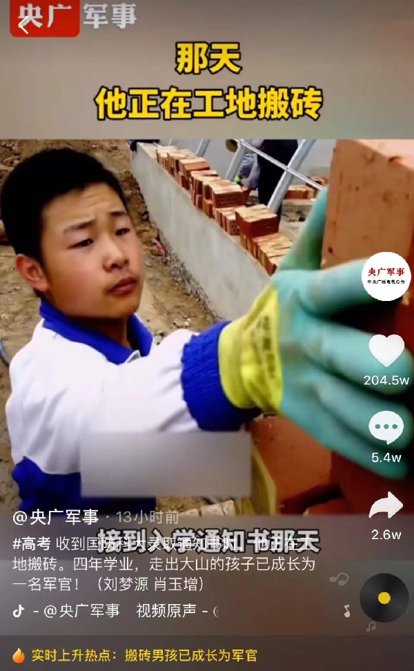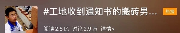 一则#工地收到通知书的搬砖男孩毕业了#的消息