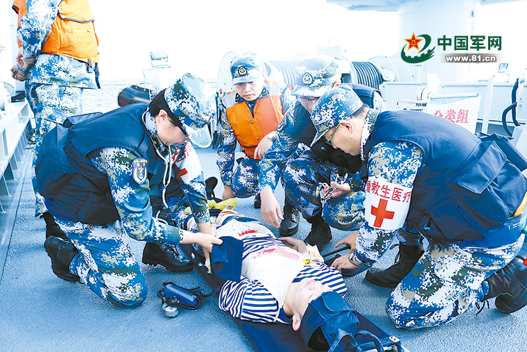 在情况复杂的海底,操纵员仅用10多分钟,就操作深潜救生艇与“失事”潜艇救生平台实现对接,建立起救援通道。2名军医进入“失事”潜艇,协助“被困人员”有序登入深潜救生艇。当救生艇浮至水面、起吊上船,早已在长岛号甲板准备的医护队迅速对8名“获救艇员”进行检伤,并按照伤员受伤程度进行紧急医疗救治。10多分钟后,一架直升机降落在长岛号飞行甲板,将“急危重症伤员”接往后方医院抢救。至此,本次救援演练顺利完成。