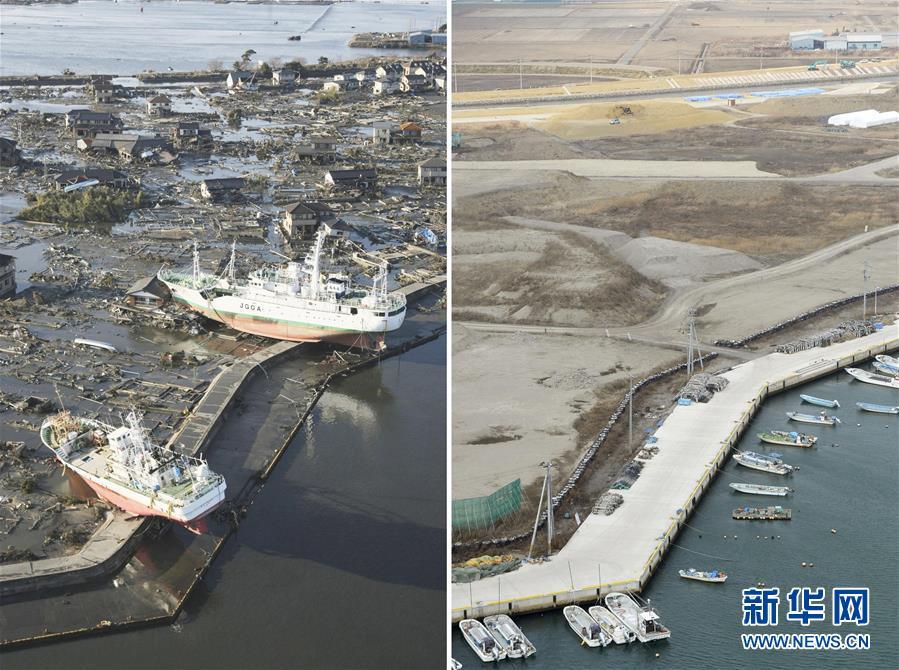 2011年3月11日,日本东北部海域发生9.0级强震,引发特大海啸,造成灾难性核泄漏。灾难导致超过1.5万人遇难,2000余人失踪。今年3月11日是大地震的五周年纪念日。图为2011年3月12日(左)和2016年3月3日拍摄的日本宫城县东松岛市的拼版照片。