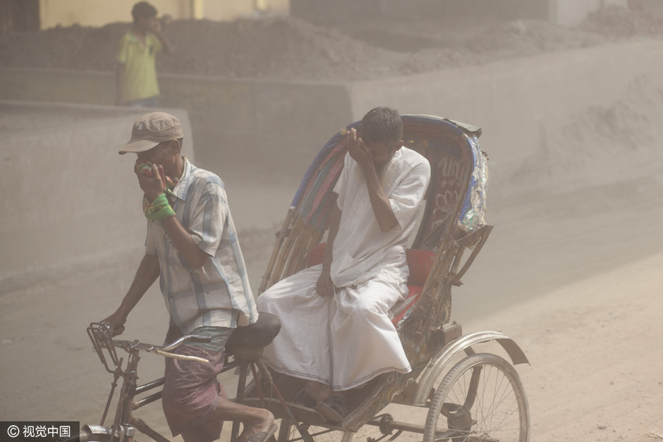 孟加拉国达卡,哈扎里巴格被铁匠研究所和瑞士绿十字组织列为地球上污染最严重的五个地区之一,在全国270家注册的制革厂中,大约有90%集中在该镇一片大约25公顷的土地上,每天向城市主要河流和供水地排放22000立方升的有毒废物。图为一条繁忙的街道灰尘浓重空气污染严重,行人掩面而行。