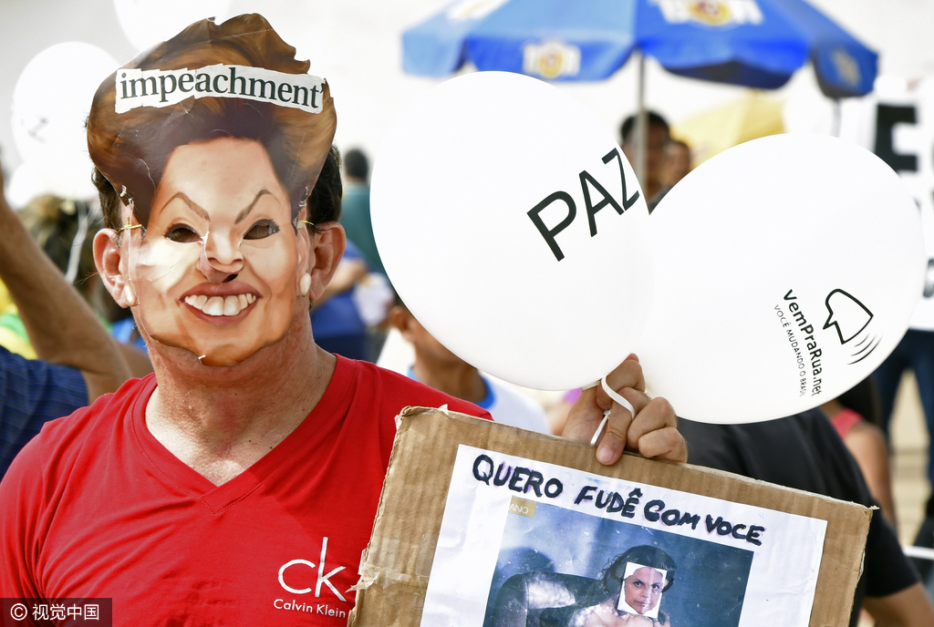 当地时间2016年3月13日,巴西巴西利亚,反政府示威者游行要求巴西总统罗塞夫下台