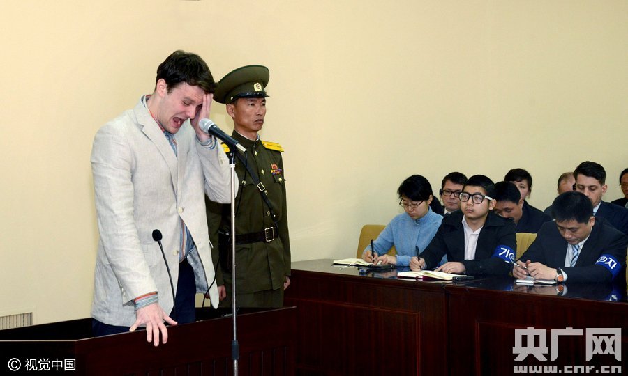 美国大学生Otto Warmbier被朝警员押送至朝鲜最高法庭。朝鲜最高法院16日以阴谋颠覆国家罪判处美国大学生Otto Warmbier15年劳动教养。