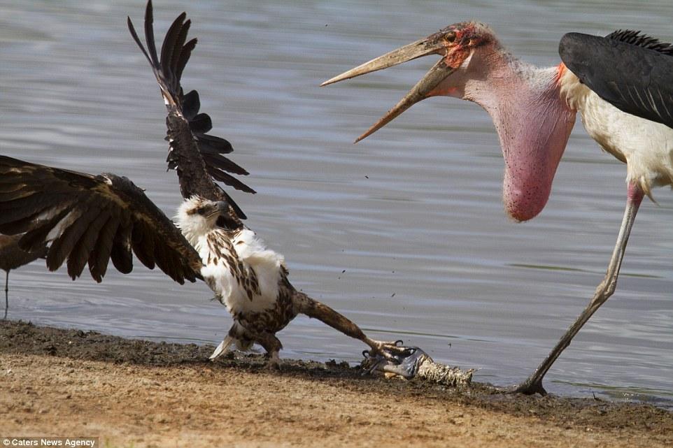 据每日邮报报道,非洲坦桑尼亚塞卢斯禁猎区的塔哥拉湖畔,近日“上演”了一场动物之间抢夺食物和尊严的罕见搏斗。狭路相逢的老鹰和秃鹳之间,为了争夺鲶鱼腐尸而针锋相对,两只大鸟频频过招,画面相当精彩。