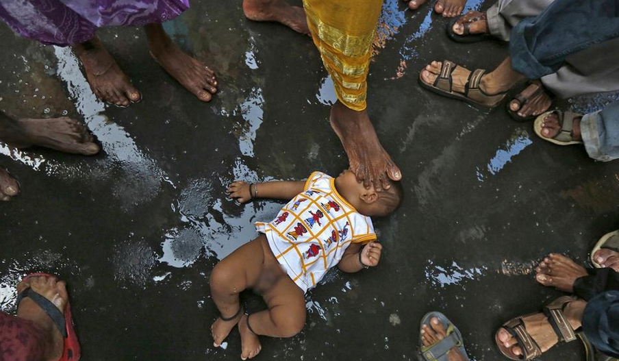 4月12日,印度加尔各答,印度教徒庆祝Gajan节,大人们用脚触摸婴儿的头部,为他们祈福。在长达一个月的Gajan节庆祝期间,教徒们为赢得神的青睐,确保他们的愿望得以实现,而进行各种祈福活动。