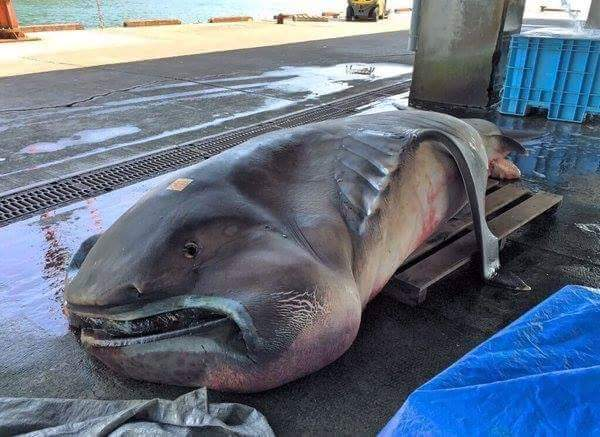 2016年4月15日,日本三重县,一位渔民在距离港口五公里的近海捕捉到一条罕见的深海大嘴鲨鱼,长五米,体重接近一吨。