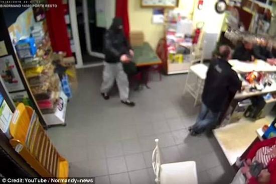 身穿黑上衣、头戴面罩的歹徒从前门闯入餐厅。