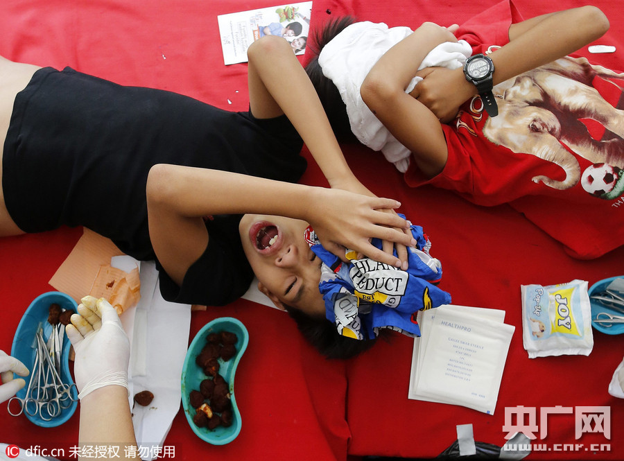 当地时间4月20日,菲律宾马利金纳市,男孩们在教室的课桌上接受割礼手术。大约300名男孩在学校放假期间接受了传统的成人仪式,即切除全部或部分阴茎包皮。