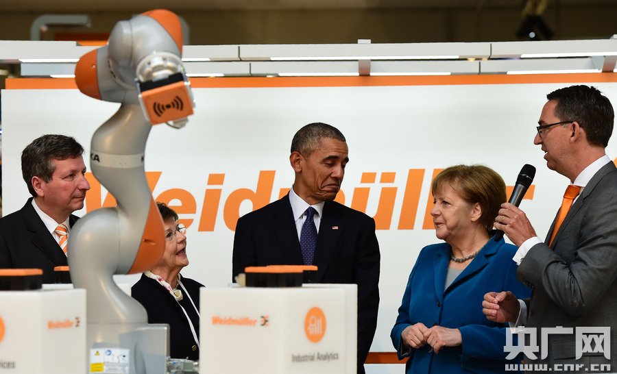 4月25日,德国汉诺威,美国总统奥巴马在德国总理默克尔的陪同下,出席参观汉诺威工业博览会。一年一届的汉诺威工业博览会为期五天,它是迄今规模最大的国际工业博览会。会上的展品展示技术含量高,被公认为是联系全球工业设计、加工制造、技术应用和国际贸易的最重要平台之一。