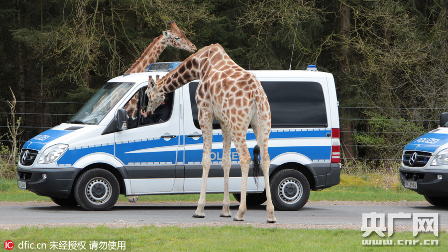 奥巴马访德当地警方高度戒备 警车遭长颈鹿调戏