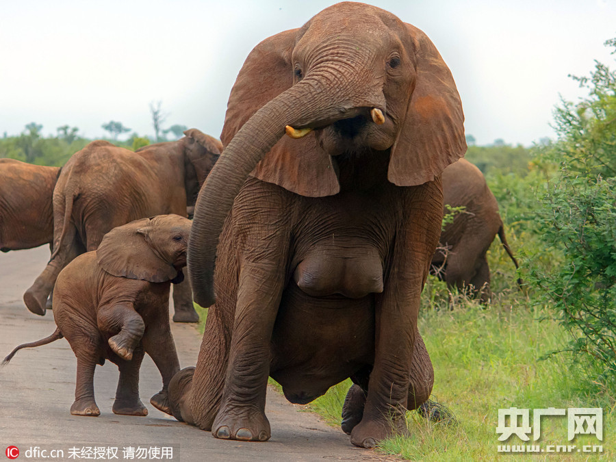2016年4月26日报道,南非克鲁格国家公园内,一头大象妈妈带着它的幼崽以及其它几头大象在散步。比较逗趣的是这位初为妈妈的母象竟然顶着一对丰满乳房,身材傲人很是吸人眼球。