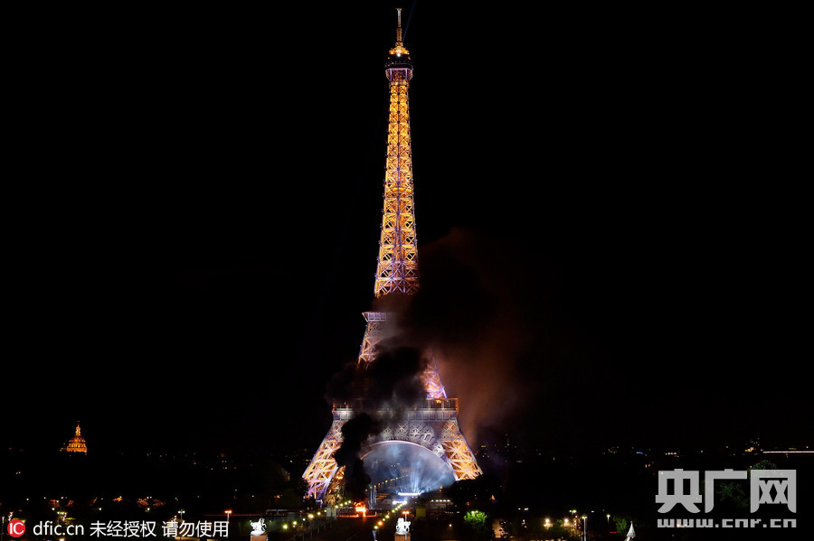 当地时间2016年7月14日,法国巴黎,法国巴黎埃菲尔铁塔燃放焰火庆祝国庆日,埃菲尔铁塔冒出黑烟。不过,据报道,埃菲尔铁塔所出现的黑烟,与附近一辆载着烟花的卡车有关,属于“技术性意外。